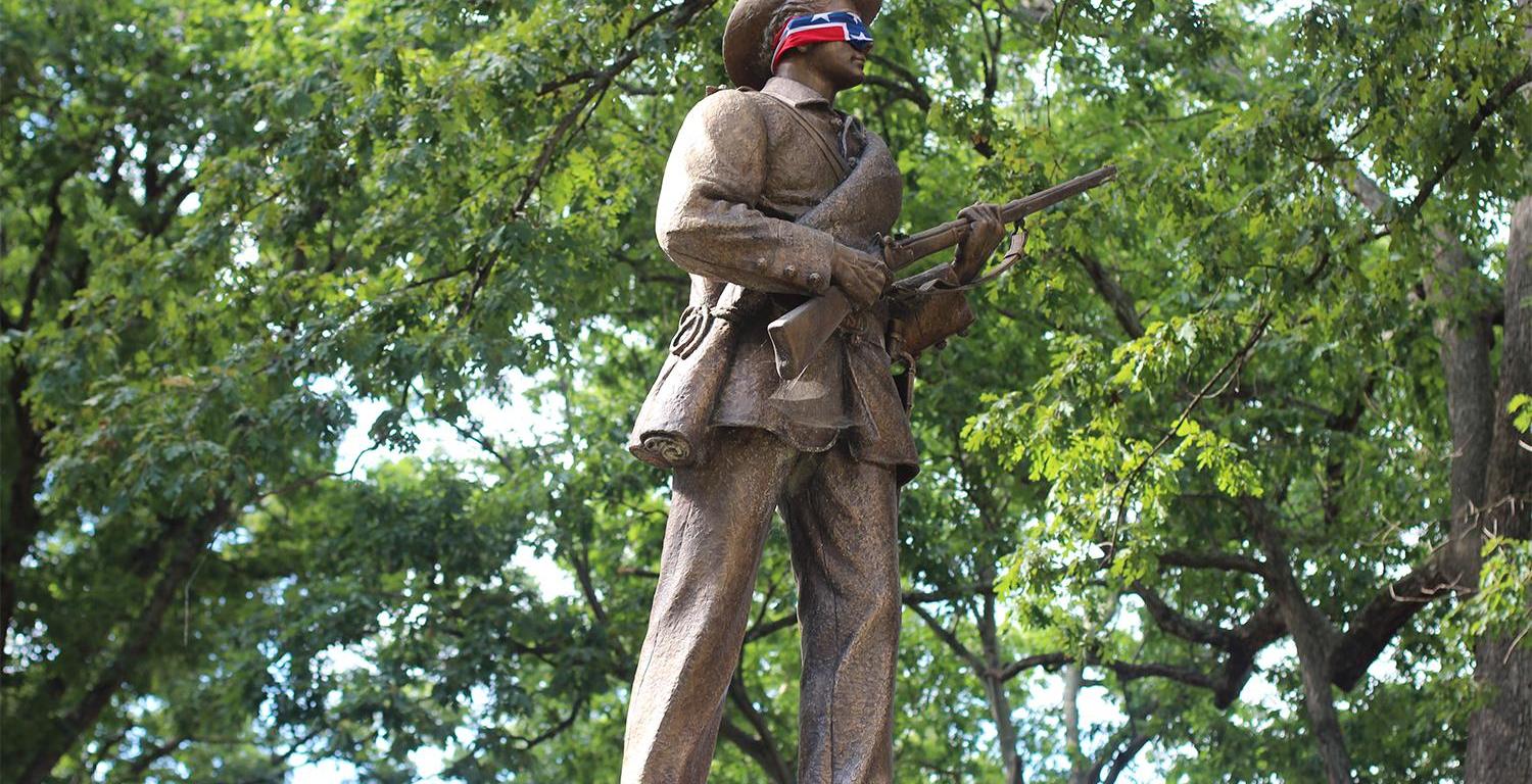 Forty feet tall, dulled from age, the statue of a uniformed young man strides forward from his stone plinth. His face is resolute. He carries a rifle held with two hands, at the ready, though he carries no ammunition box on his belt. In brass relief on his granite base, the same young man sits with a book open in his hands. A tall, robed woman bearing a sword lays a hand on his shoulder. A book lies discarded at his feet as he turns his face to meet her gaze.