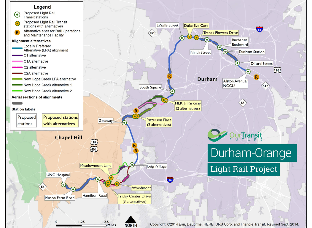 Feature Photo: A map showing the proposed route map of the Durham-Orange Light Rail. Credit: GoTriangle