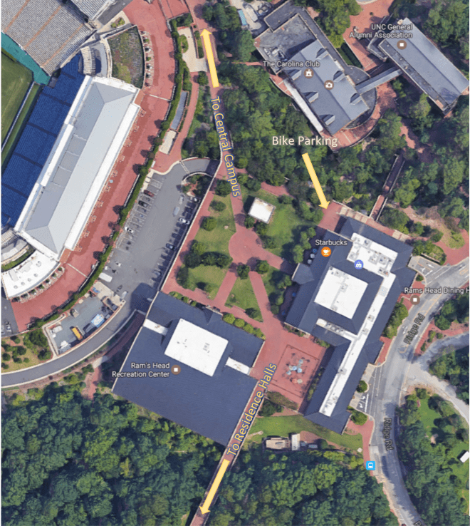 Let’s examine two examples from the UNC-Chapel Hill campus. First, the Ram’s Head Dining Hall. Located along a major bicycle and pedestrian thoroughfare between the central campus and most of the undergraduate residence halls, this is a great example of bike parking that doesn’t really make sense. Below is an aerial image of the site.