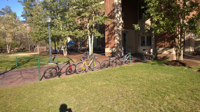 The key is not about the type of bike rack but the placement of the bike rack in relation to the people who are going to be looking for it and using it. For some reason, at the Ram’s Head Dining Hall designers didn’t place the majority of bike parking where it could be easily seen by the people who would be looking for it, and so people improvise. At New East, there is no mystery. The bike racks are right where any user would expect them to be: clearly visible from Cameron Avenue.